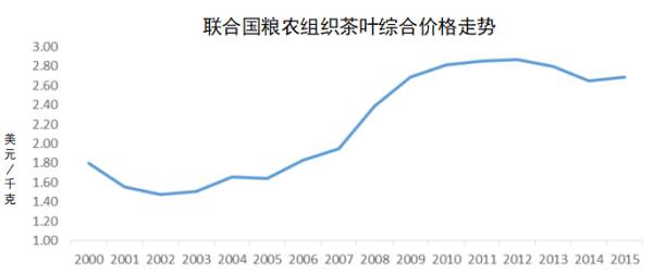 作为世界茶叶市场的指示性价格,FAO茶叶综合价格在过去十年基本保持稳步上升,在2012年8月-2013年3月间,世界茶叶价格稳定在3美元/千克左右,此后国际茶叶价格持续走低,2014年12月份茶叶价格出现最低值2.44美元/千克。由于天气干旱导致肯尼亚等国茶叶供应紧张,自2015年开始,全球茶叶价格稳步回升,7月份茶叶价格比6月份茶叶价格增长率超过10%,达2.90美元/千克。