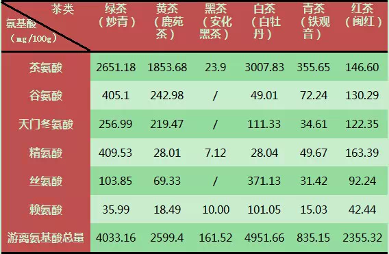 由于制茶的茶树品种鲜叶不同,氨基酸含量当然会不同。上表呈现的数据,主要是为了示例不同茶类氨基酸总量及其几种主要氨基酸含量的差异。