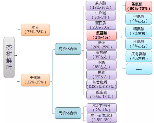茶叶中目前已发现并鉴定的氨基酸有26种,除20种蛋白质氨基酸均发现存在于游离氨基酸中,另检出6种非蛋白质氨基酸。其中,最主要的有茶氨酸、谷氨酸、天门冬氨酸和精氨酸。尤其是茶氨酸,被认为是茶叶的特征氨基酸,占茶叶干物质的1%~2%,约占茶叶中游离氨基酸的60%-70%,是茶汤鲜爽味的主要成分,与绿茶品质的正相关系数达0.787~0.876。