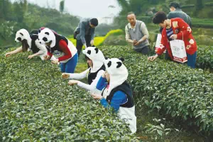 2014年3月12日,四川省雅安市,一群身穿“熊猫衣服”的采茶姑娘在凤鸣山开始了2014年“熊猫茶”春茶采选。这些茶树是从2011年11月起用近10吨熊猫粪便种植出来的。“熊猫茶”中的“稀品”定价近22万元一斤。