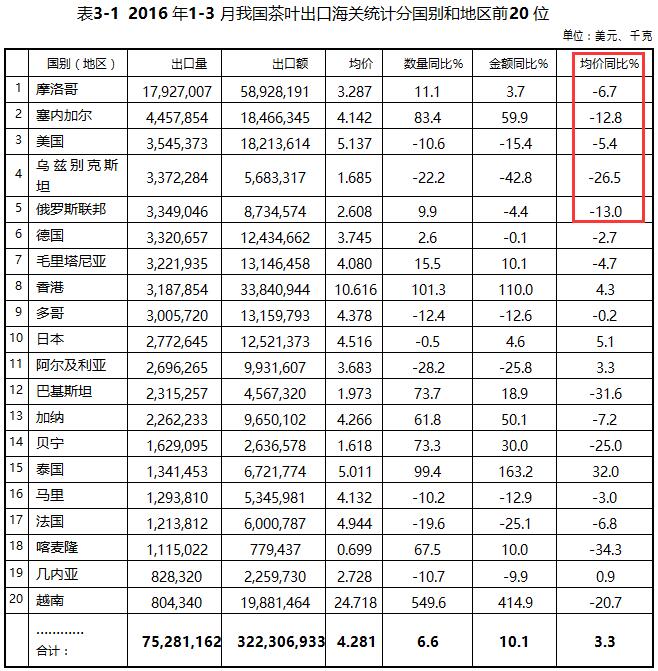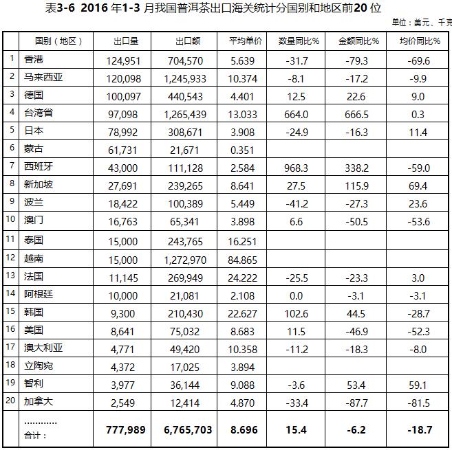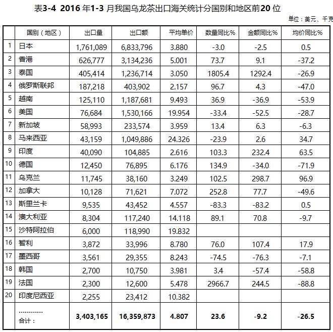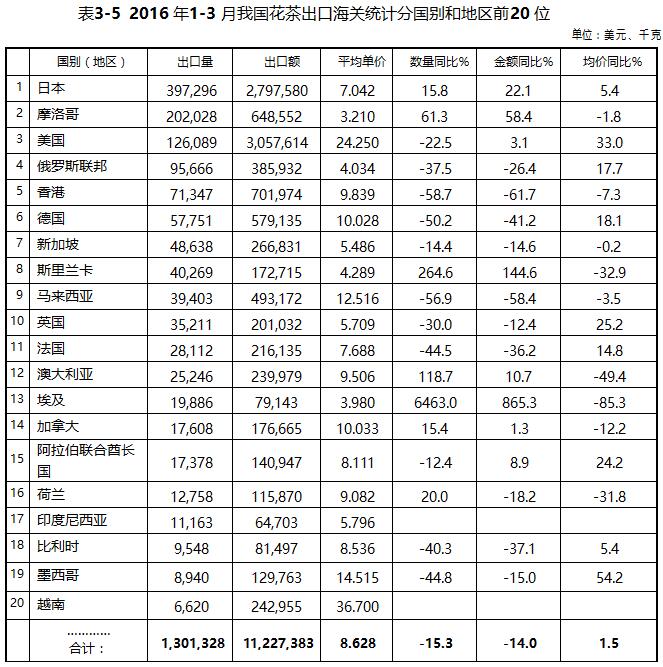 2016 年 1-3 月我国茶叶出口海关统计数据