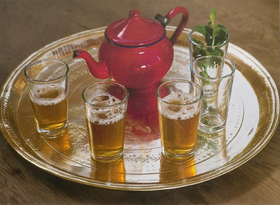 摩洛哥的茶壶很奇特,一般的茶壶外表由铜浇铸而成,壶内镀上一层银,壶嘴很长,类似老北京功夫茶馆中的茶壶。茶杯雕刻着富有民族特色的图案、花纹,非常精致。传统设计的镀银青铜茶壶和托盘,是摩洛哥人饮用传统的薄荷茶时常常使用的茶具。节日或任何一个亲朋好友相聚的场合,这样一套采用传统工艺制作的茶具一定可以为聚会增添不少魅力。摩洛哥茶具,更是珍贵著名的艺术品。摩洛哥国王和政府赠送来访国宾的礼品,一为茶具,二为地毯,都属于驰名中外的物件,一套讲究的摩洛哥茶具重达100千克。